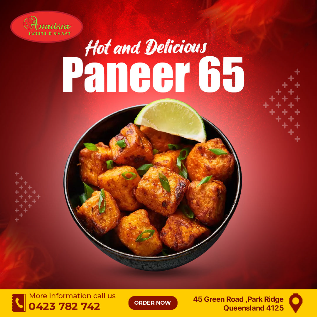 Paneer 65 at Amritsar Sweets & Chaat is a spicy, crispy Indian street food delicacy featuring marinated paneer cubes deep-fried to perfection.